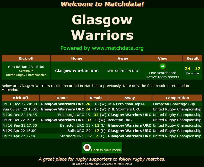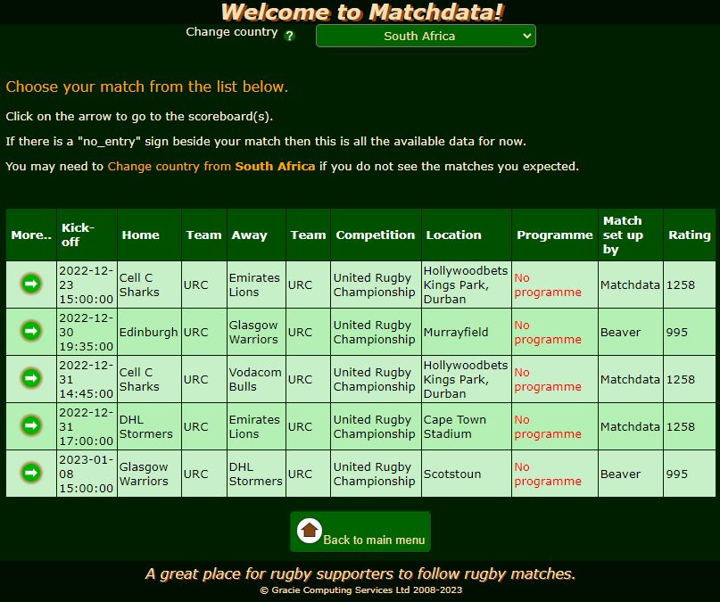 In this example there are no forthcoming matches on Matchdata in South Africa. So we selected the "United Rugby Championship" from the "Competition" filter to get the list of matches shown below. Here you can see the Cape Town "Stormers" game against "Glasgow Warriors" listed. If that was the game you were looking for, then click on the arrow to look for scoreboards for the match. You can also see an earlier fixture between the "Stormers" and the "Lions".