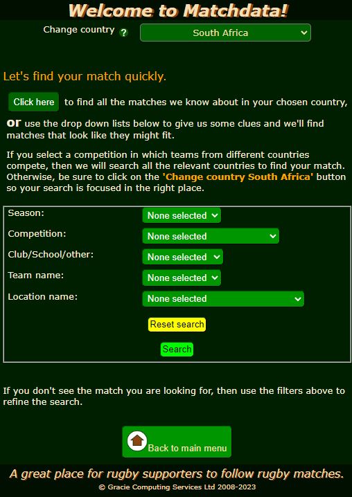 Before you search for your match, you might get lucky and find your match listed in the short list of upcoming matches shown below the main menu matchdata.org page so it is always worth looking there.