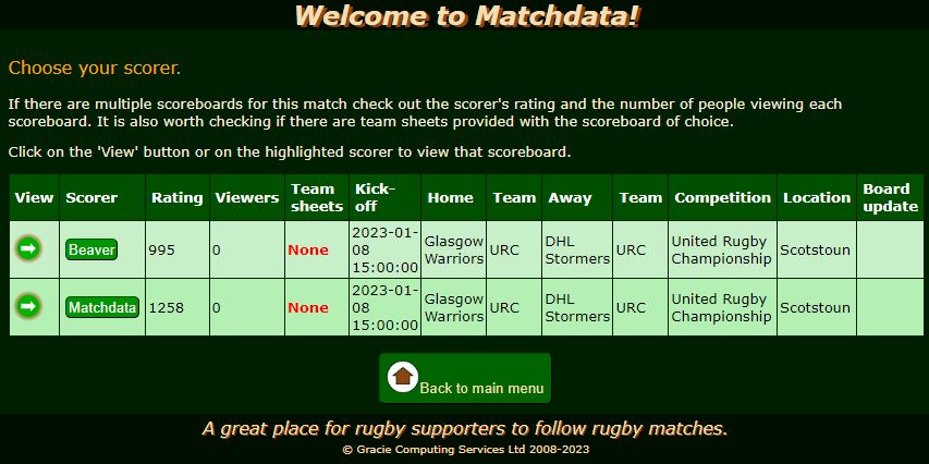 Here we can see that two administrators have each set up a scoreboard for our chosen match. As yet neither has set up team sheets for the match. You can see this from the "Team sheets" column. One administrator has a higher rating, but we can't yet tell who is prefered by other spectators for this match (see the "Viewers" column).